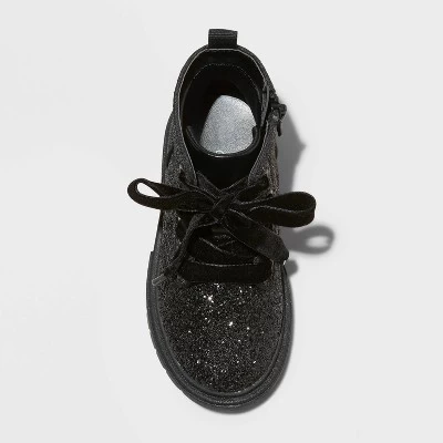 Make sure your toddler is ready for a day of adventure in sparkling style with these Khloe Combat Boots from Cat & Jack™. These medium-width boots feature a round-toe design with comfy lining and insoles to help your tiny tot walk in comfort. The upper features allover sparkly detailing for glam appeal, while a lace-up front and side zipper complete the look with easy on/off and a snug fit.